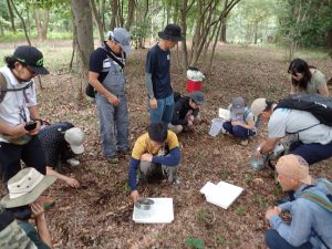 篩とパレットを使用して、実際に林床に生息する微生物・昆虫を探して、中辻講師に色々質問コーナーを設けて面白く実施研修を終えました!